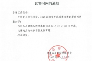 湖南省足球聯(lián)賽組織委員會發(fā)布通知,調(diào)整2025湘超決賽比賽時間,永州隊與常德隊的決賽時間為12月27日19:45開球,比賽地點為長沙市賀龍體育場。