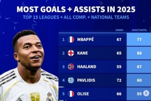 體育資訊1月2日訊 2025年已經(jīng)過去,《轉(zhuǎn)會(huì)市場(chǎng)》也統(tǒng)計(jì)了2025前15聯(lián)賽球員的俱樂部+國家隊(duì)各項(xiàng)賽事總參與進(jìn)球情況,皇馬前鋒姆巴佩領(lǐng)跑。